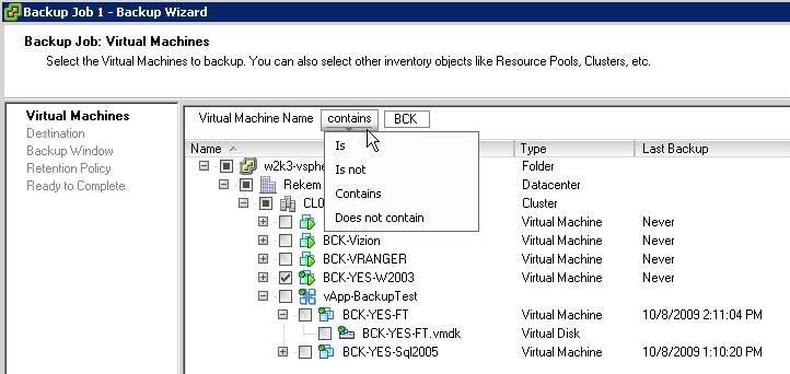 A simple right-click on a VM or a folder starts the backup wizard. By default, the wizard includes the right-clicked VM or folder in the selection, but you can extend your selection as you please. In the top of the selection window, a filter option makes selecting VMs simple. A backup of a resource pool checks which VMs are members of the pool before each backup. Removing or adding a VM to a resource pool also changes the backup selection.