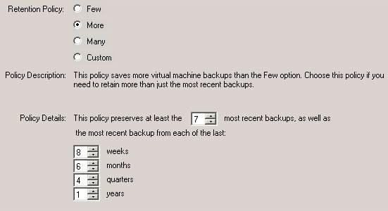 VMware Data Recovery is the only one of the four compared backup solutions that offers such a fine-grained retention policy. The policy details offer the option to set the number of yearly, quarterly, monthly and weekly backups that should be retained as well as the number of most recent backups. It is possible to choose one of the three defaults or define custom settings. In my opinion, every backup product should have this feature.